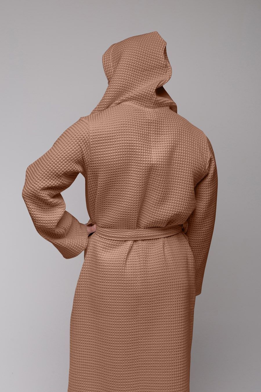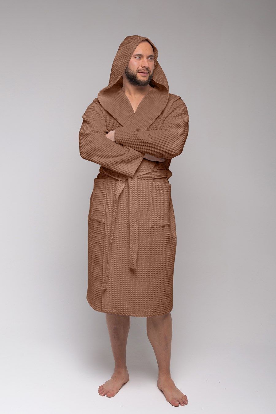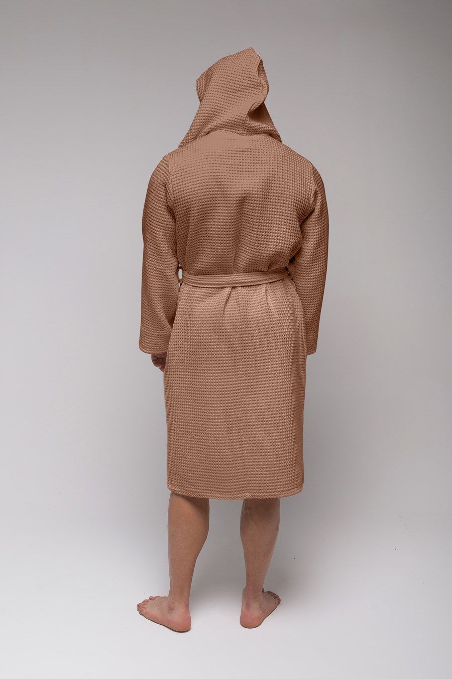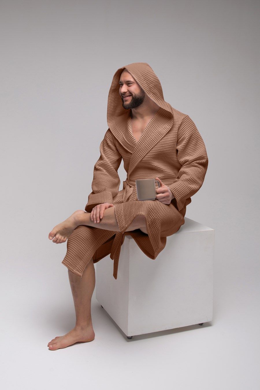 Халат достаточно легкий, а мелкие квадратики вафельной ткани создают воздушную подушку между халатом и кожей, за счет чего сохраняется комфортная температура тела, а после водных процедур кожа быстрее высыхает.