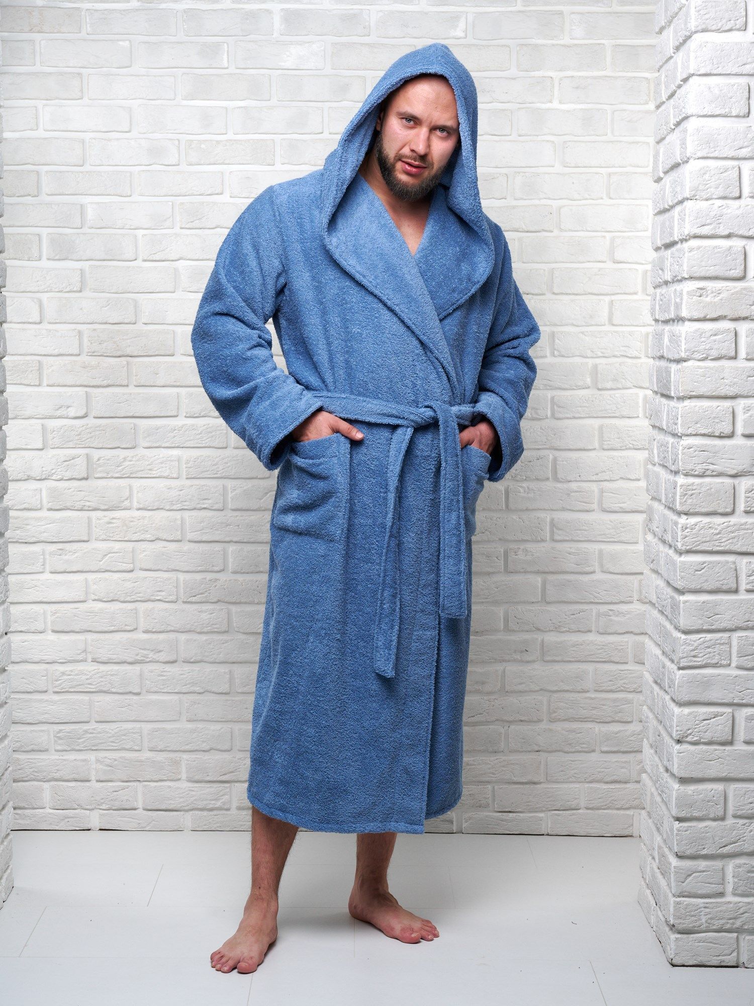 Халат мужской махровый PandaHug с капюшоном, лазурный
