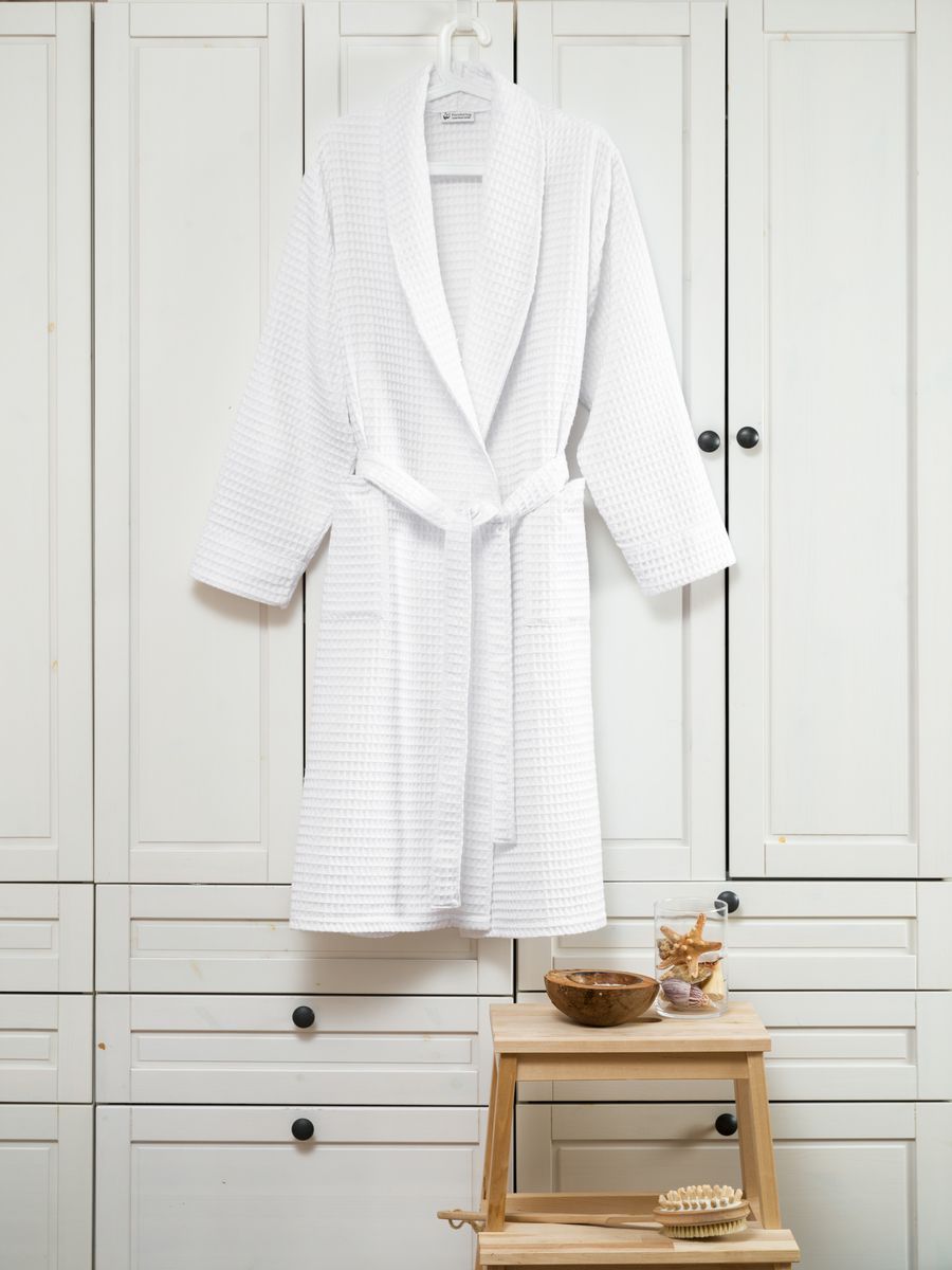 Вафельный халат также активно используется в гостиницах, в фитнес-центрах, салонах красоты, SPA. Это гигиенично, практично и выгодно: для стирки требуется меньше воды, чем для махровых, они быстрее сушатся, а ткань долго не изнашивается.